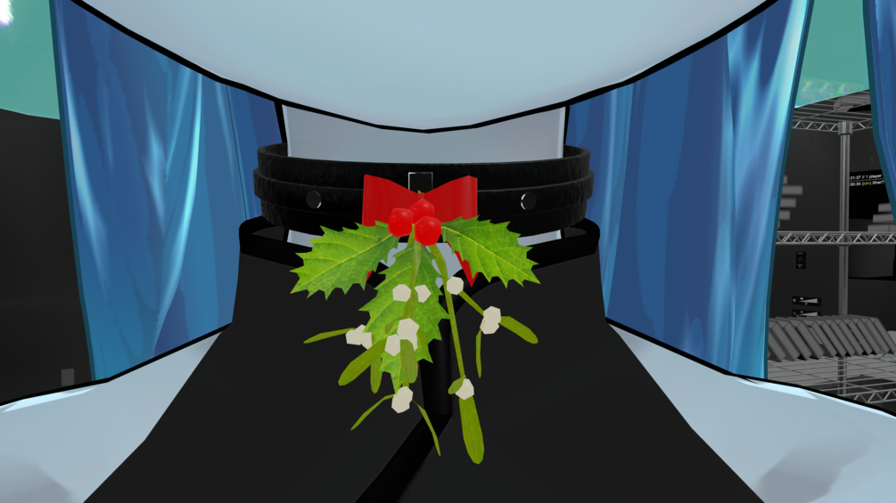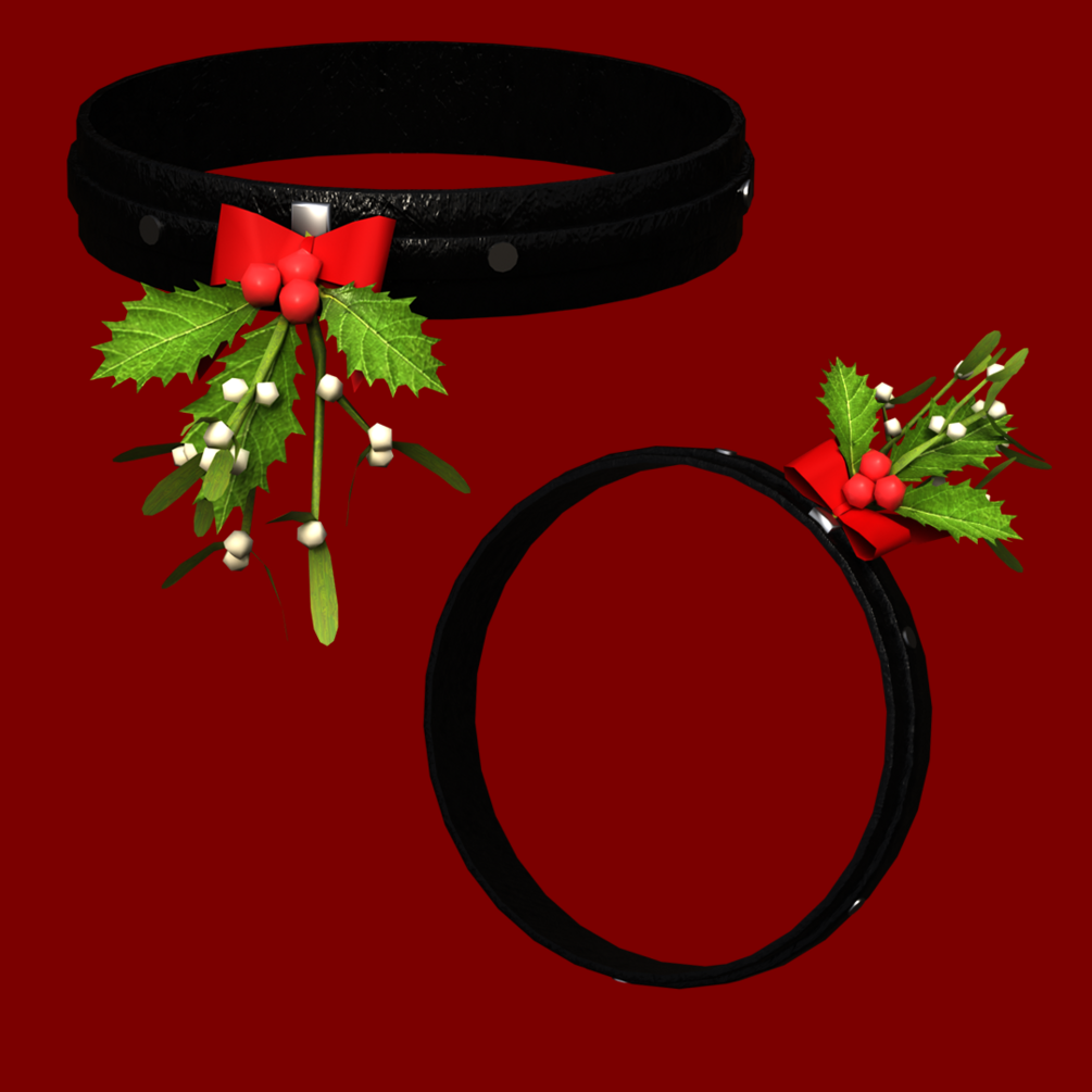 A leather Christmas collar with mistletoe and holly for VRChat, usable as an avatar asset. Includes textures for diffusion map, roughness map and normal map.